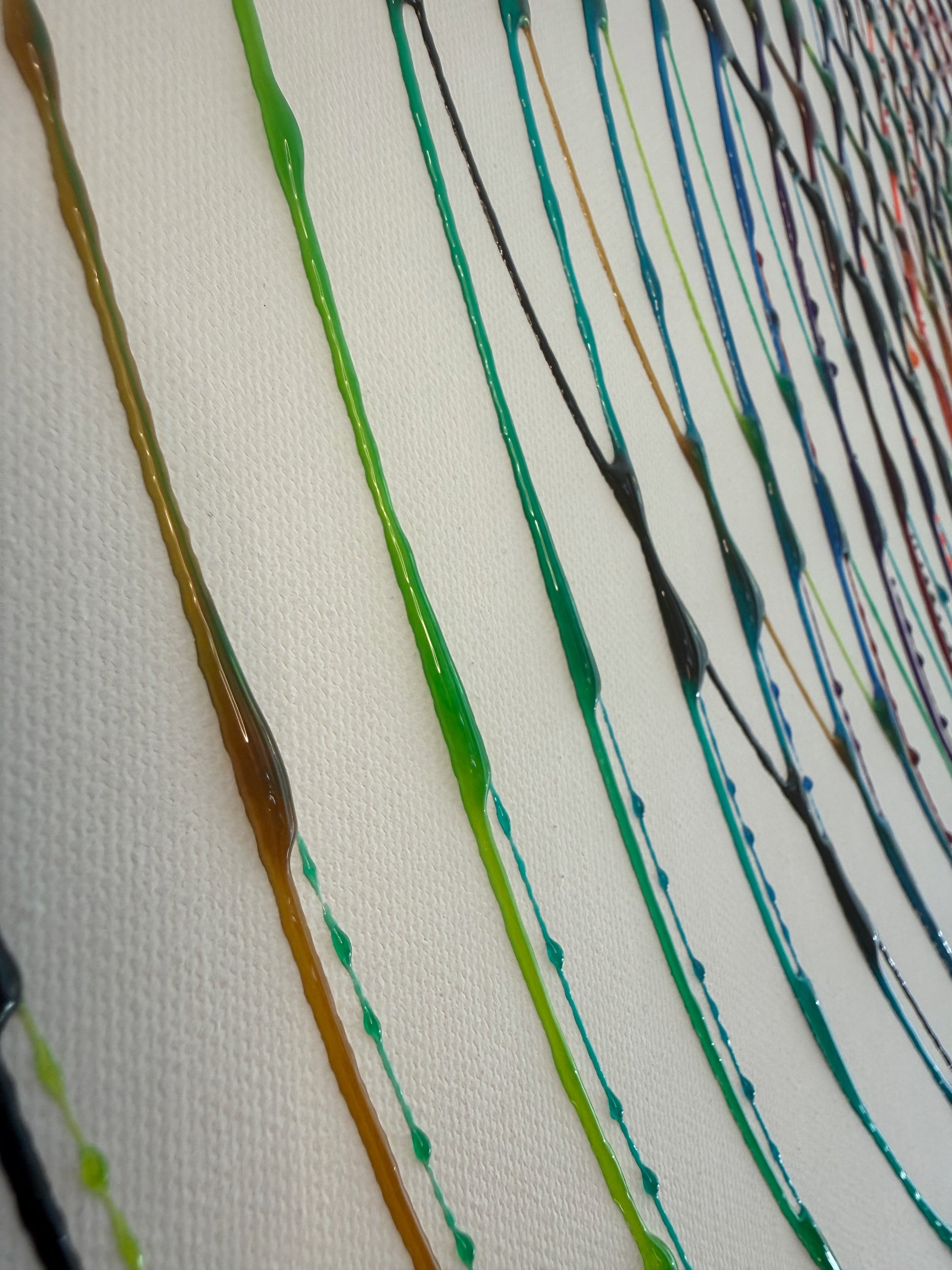 Chaque ligne, tracée en pigments mêlés à la résine, capture la tension entre la chute et l’ascension, la densité et la transparence.